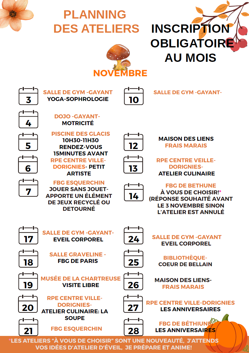 Découvrez le planning du mois de novembre avec les lieux, horaires et activités.