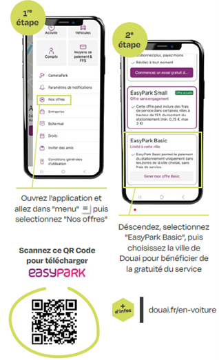 Dans ce contexte, la ville de Douai a souhaité que le tarif appliqué à l’usager avec Easypark soit le même tarif qu’à l’horodateur (les frais de service étant pris en charge par la ville de Douai). Pour bénéficier de cette prise en charge des frais par la ville, il sera nécessaire d’aller dans le menu de l’application « Nos offres » et choisir l’offre Basic « EasyPark Local » et sélectionner « Douai » dans les villes proposées.