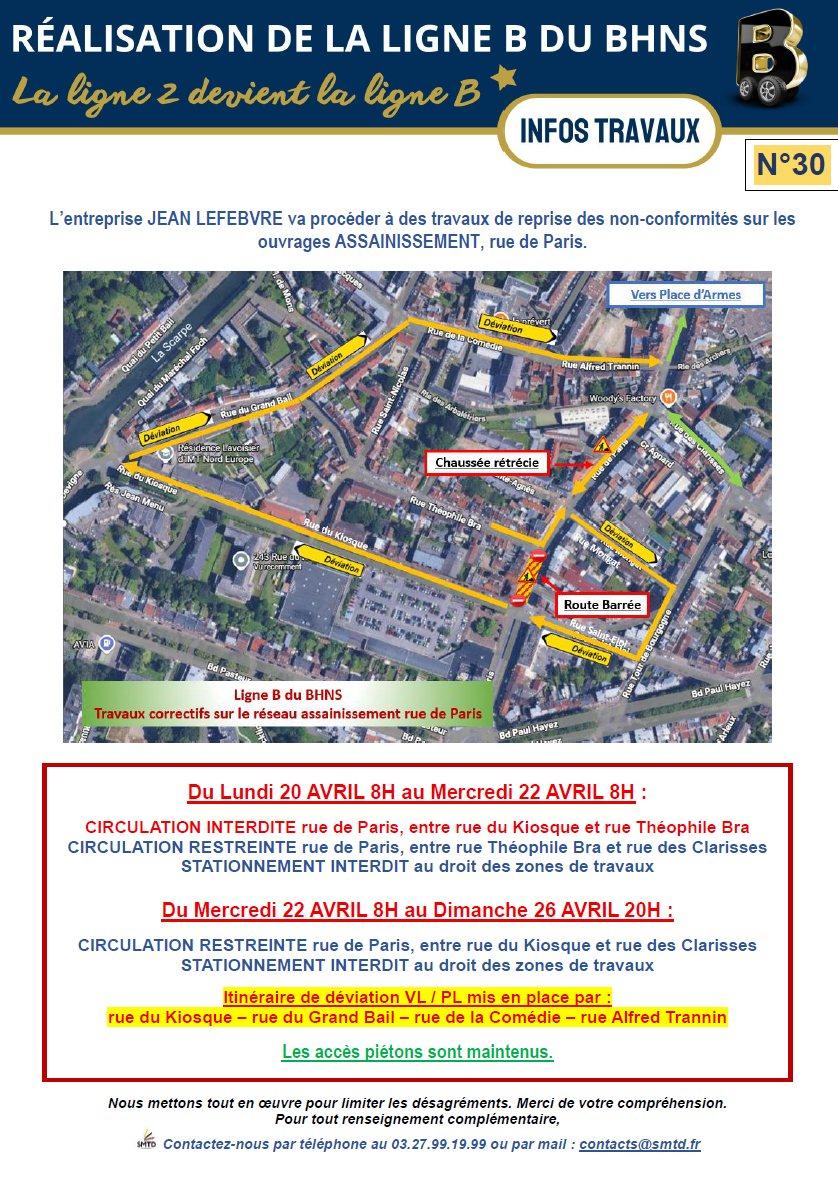 Des travaux pour la ligne B du bus à haut niveau de service (BHNS), rue de Paris, sont prévus du lundi 20 avril à 8h au dimanche 26 avril à 20h.